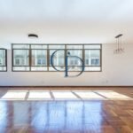 Imagine um apartamento amplo, de 170 m² de área útil, com três dormitórios (incluindo uma suíte) e duas vagas de garagem fixas. A começar pelo hall social clássico e elevadores reformados, a experiência é de chegada refinada. O living, iluminado por grandes panos de vidro, traz charme com tacos de madeira e ventilação natural. A cozinha, com layout perfeito para um projeto gourmet contemporâneo, é funcional e acolhedora.