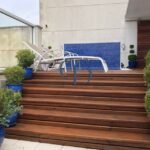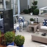 Área externa com jardim, fonte, churrasqueira e piscina iluminada