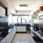 Cozinha moderna com porcelanato e bancadas em granito preto