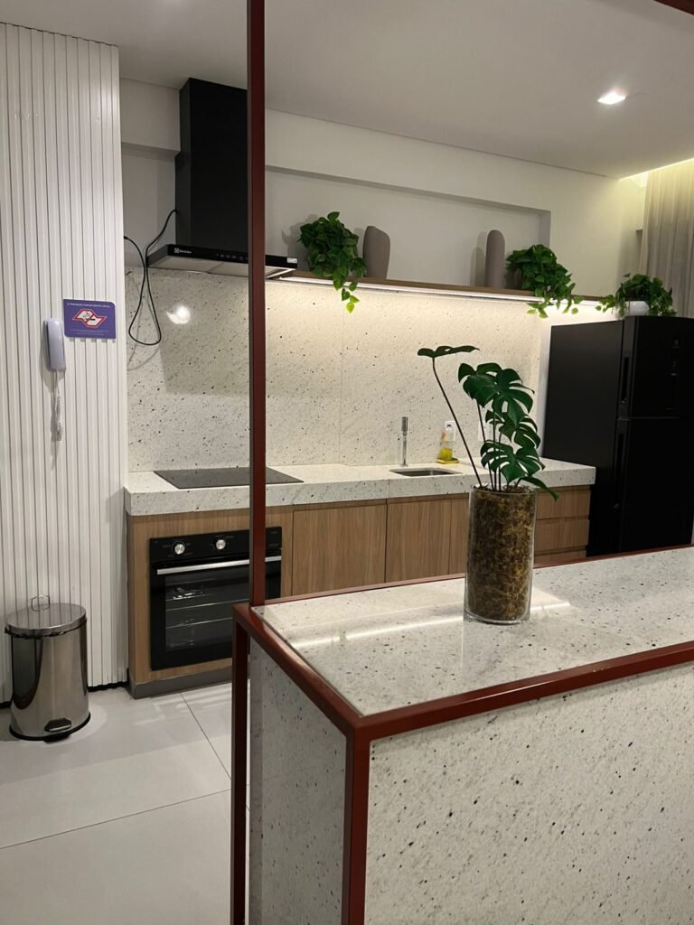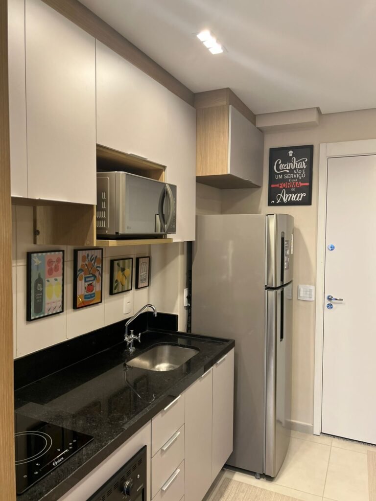 Possui varanda, cozinha americana equipada, armários planejados no quarto, banheiro e cozinha, além de ar-condicionado e chuveiro a gás. O imóvel está completo, pronto para morar — é só entrar com as malas.